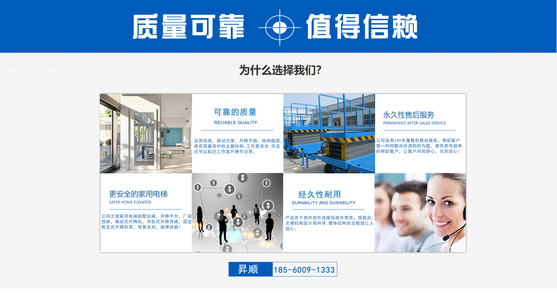 山東昇順液壓升降機械有限公司是一家主營家用電梯,別墅電梯,升降平臺,廠房貨梯,移動式升降機,導軌式升降貨梯,固定剪叉式升降機等產品企業,質量可靠,值得信賴。 用戶至上,以用戶為中心”是公司永遠堅持的服務宗旨,贏得用戶的贊許是我們的榮譽,及時滿足用戶的需求,是我們公司的愿望。長期以來,公司員工以優質的服務,取悅于用戶,以誠信的言行取信于用戶,得到了用戶們的好評。我們期待著與您更加愉快的合作!公司的發展,離不開社會的大力支持,在社會的支持和幫助下,我們正昂首闊步邁向未來! 我們的經營方針是:以質量求生存,以產品求發展,以信譽保合作,以服務贏客戶?! ”竟緦Ξa品質量和各項服務恪守合同承諾,并愿與新老客戶精誠合作,共創未來?! 」揪瘢簞撔率侵黝},超越是不懈的追求?! 」咀谥迹盒抛u保證,誠信為本。 我們會以合理的價格,良好的信譽,雄厚的實力,優質的產品,最周到的服務,服務于廣大新老客戶!...